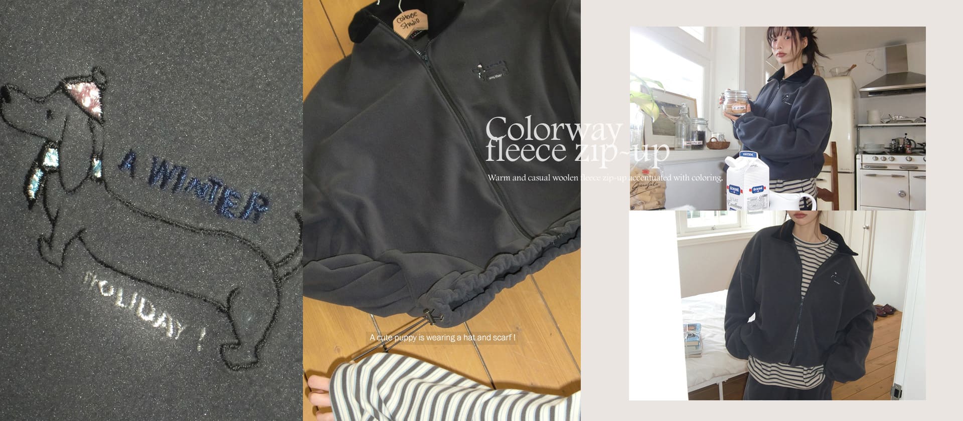 보송하고 따듯한 후리스 소재로 보여드리는 모코위드의 자수 후리스 반집업 맨투맨