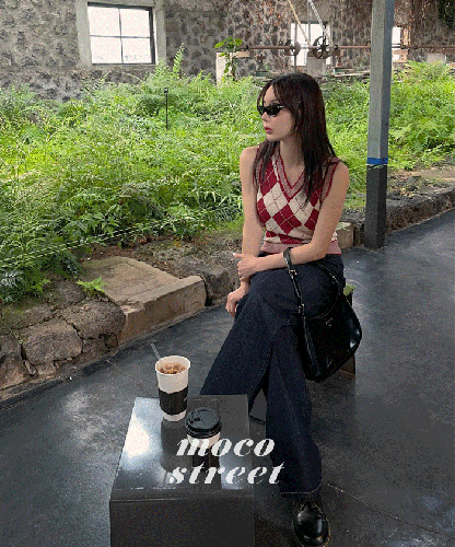 (빈티지와인 컬러만 진행)하이틴 감성이 느껴지는 모코스트릿 아가일 니트 베스트! 핏한 실루엣으로 단독 착용해도 예쁜 디자인이에요:)