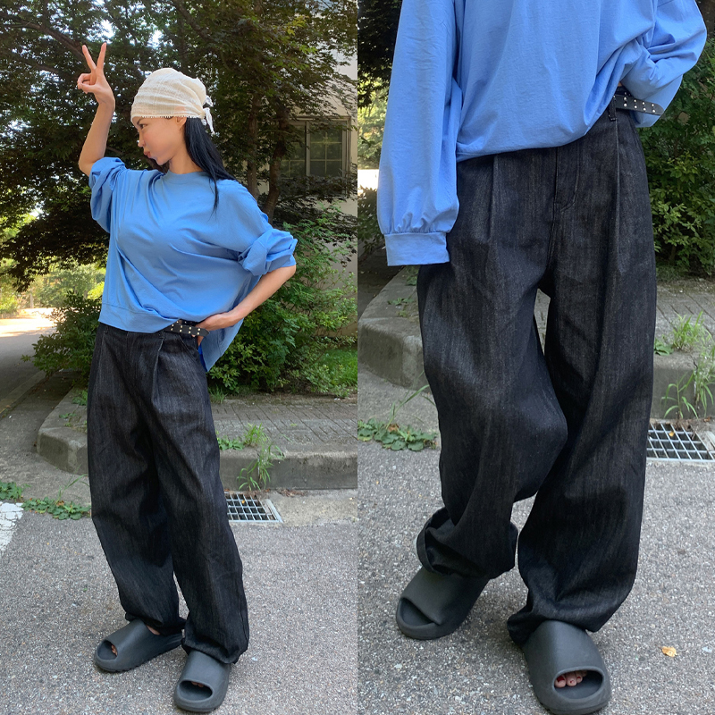 # 핀턱으로 포인트를 준 와이드 생지 데님팬츠