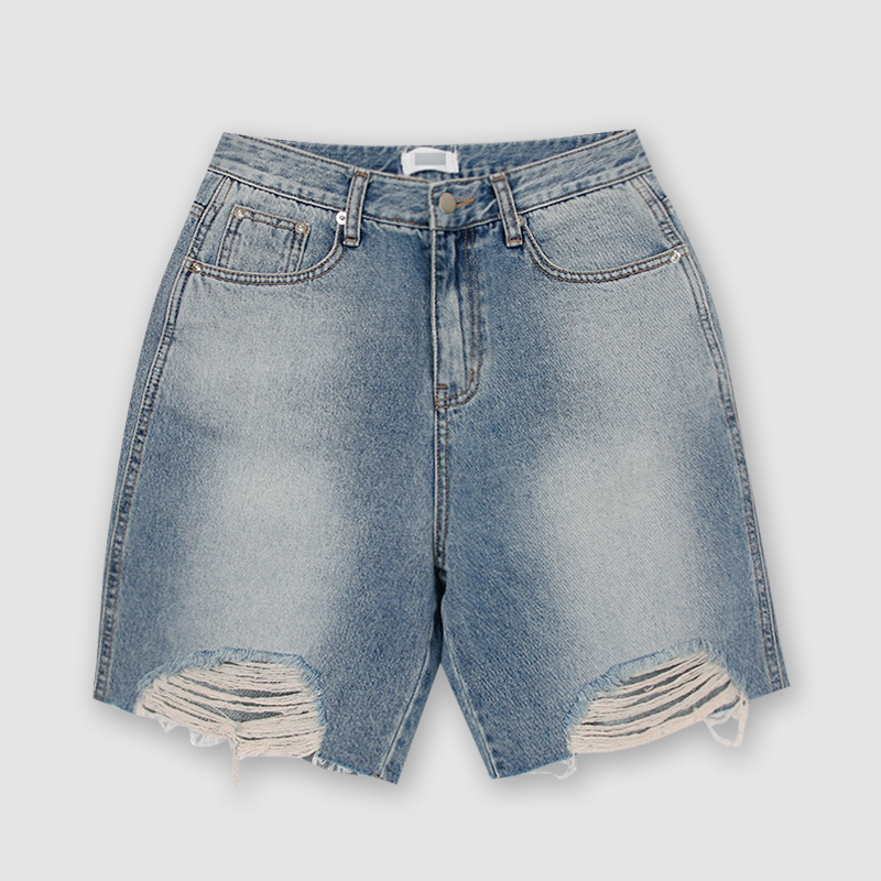 구제 디테일과 백포켓 워싱이 포인트인 데님 반바지