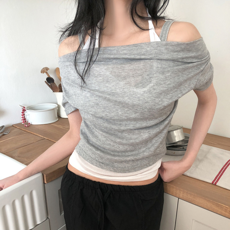 63720 [여름신상할인🌸레이어드티]홀터 레이어드 반팔티 #일체형레이어드 #반팔티 #오프숄더티 #홀터넥티 #드레이프티 #여름티셔츠 #여름상의 19900
