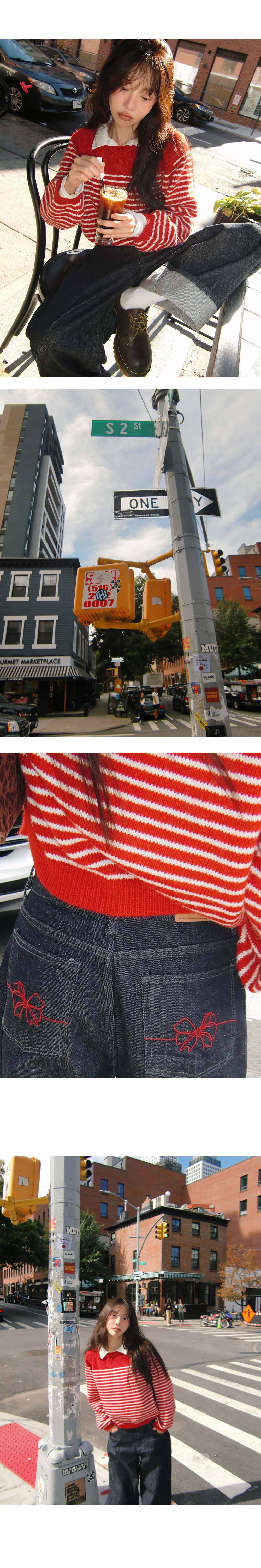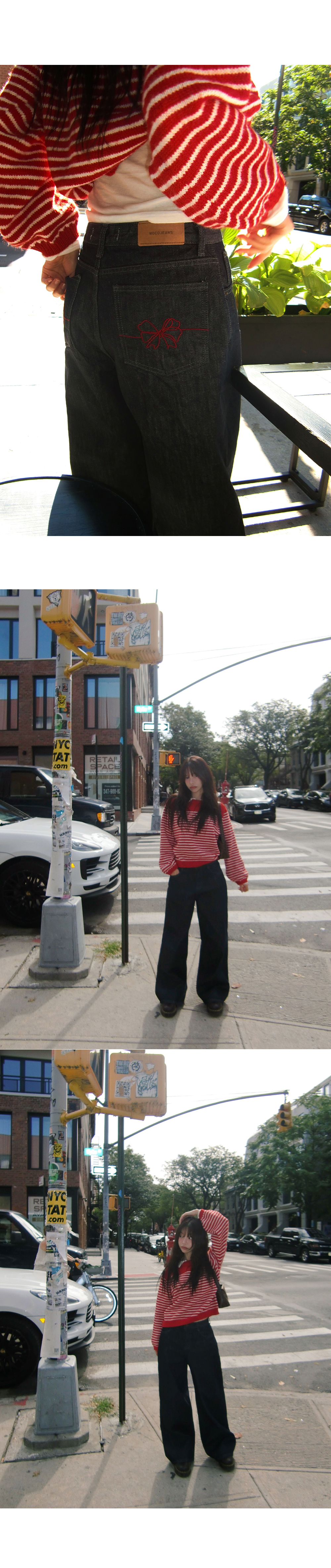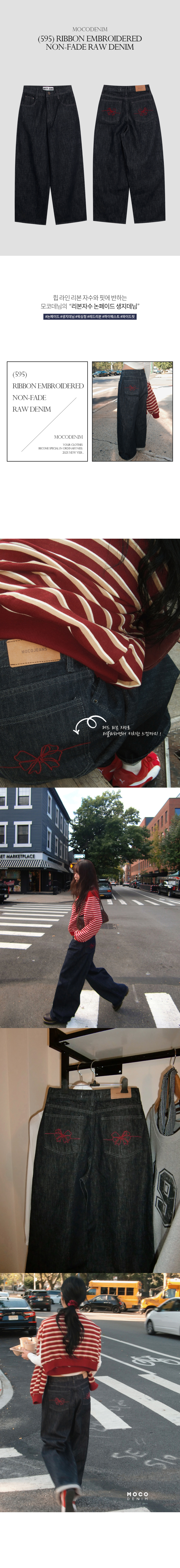리본자수로 러블리&힙 포인트를 준 논페이드 생지 데님팬츠. 와이드한 핏으로 누구에게나 잘 어울리는 청바지 입니다. 모코,모모가 가을데님으로 추천드려요!