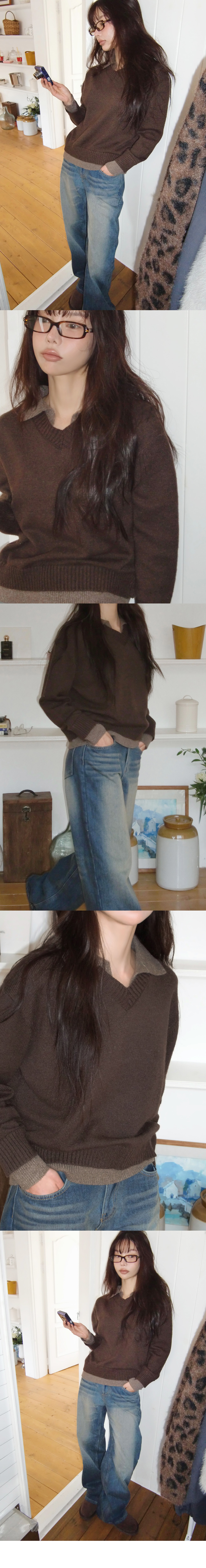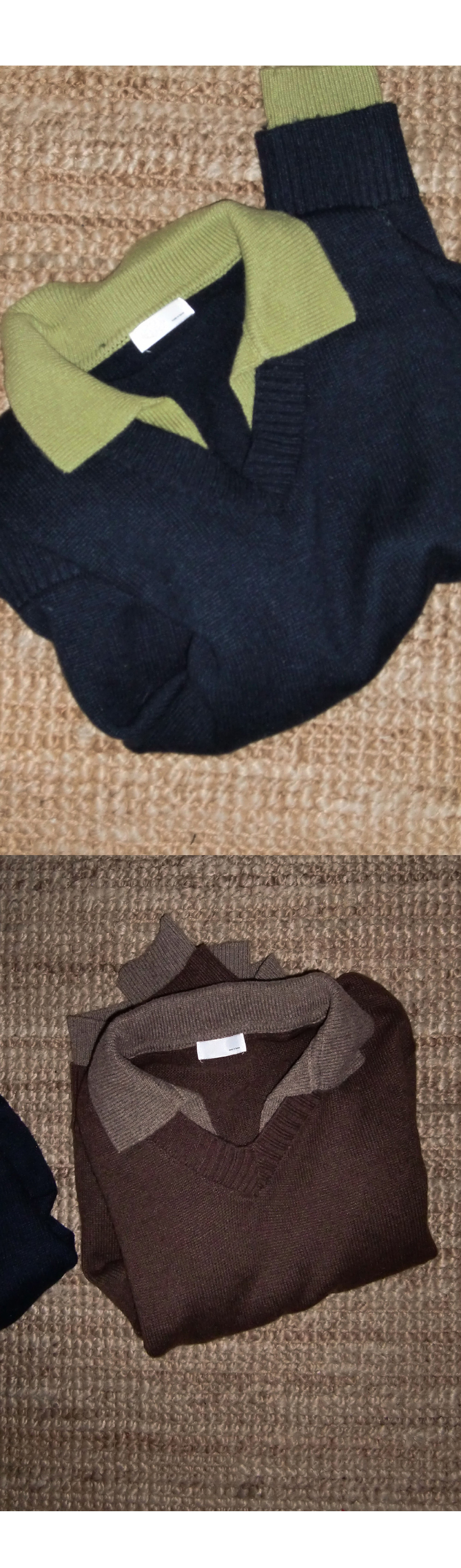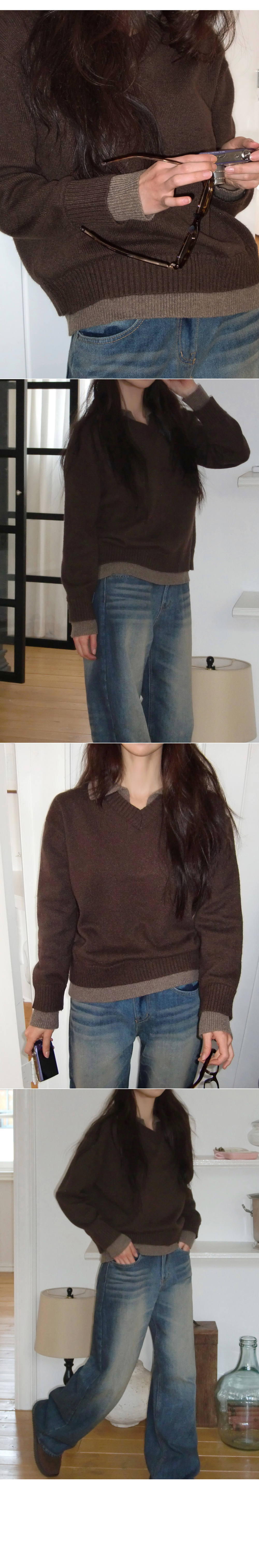 # 배색 카라 디테일의 브이넥 레이어드 니트
