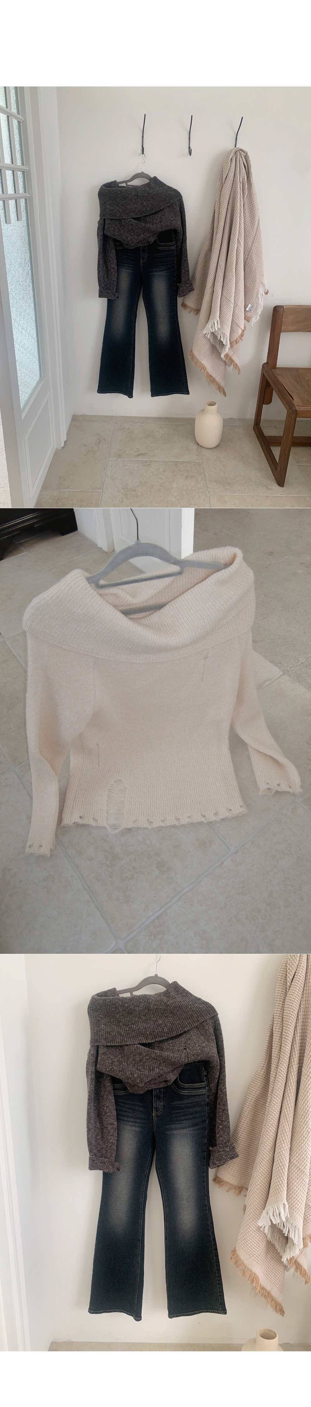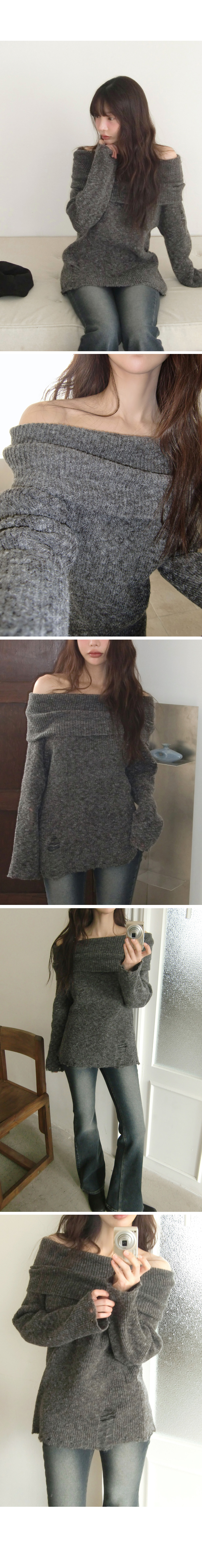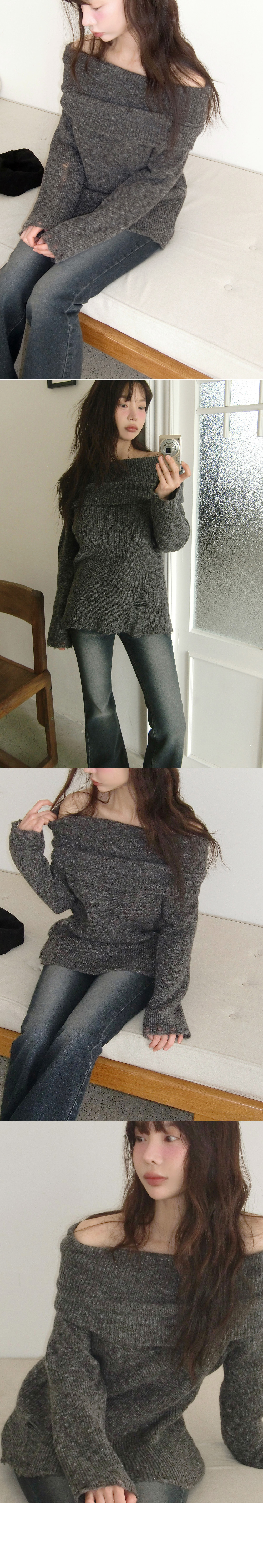 데미지 디테일로 포인트를 준 폴드 오프숄더 니트