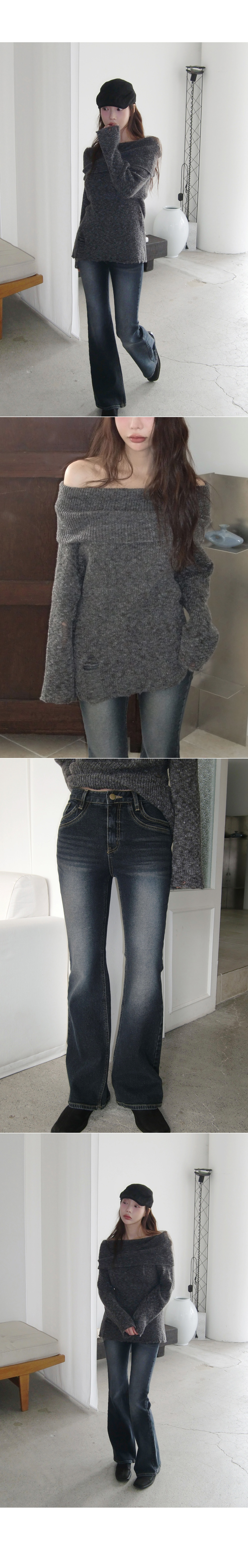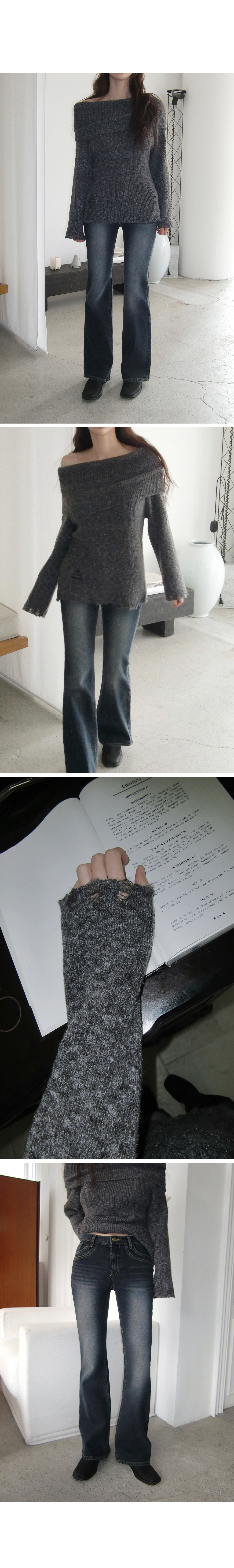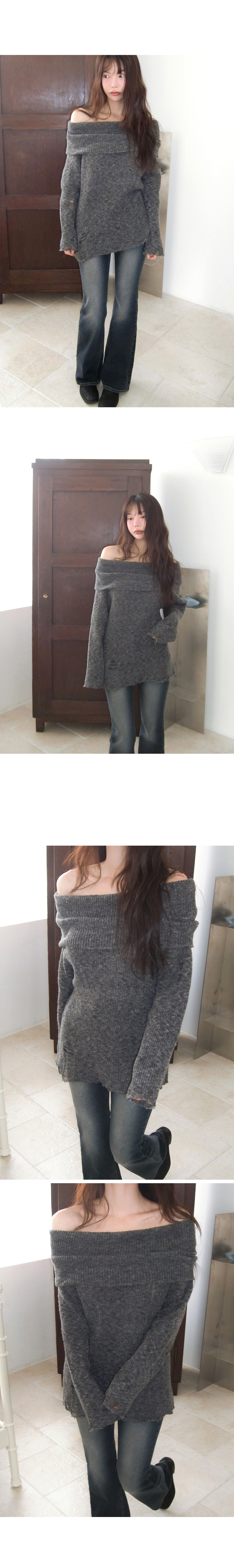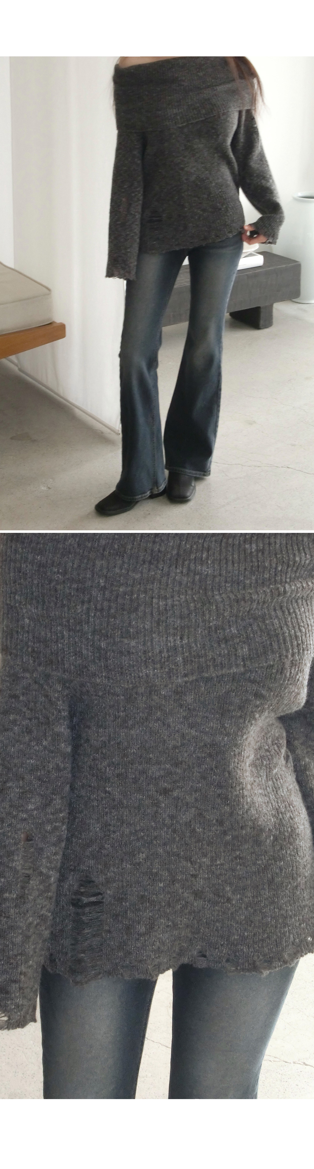 데미지 디테일로 포인트를 준 폴드 오프숄더 니트