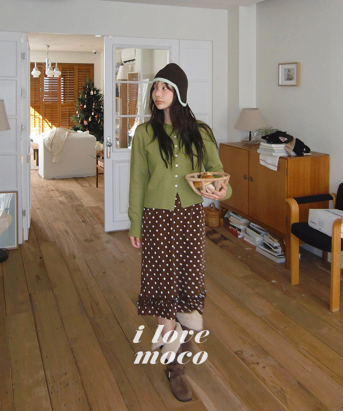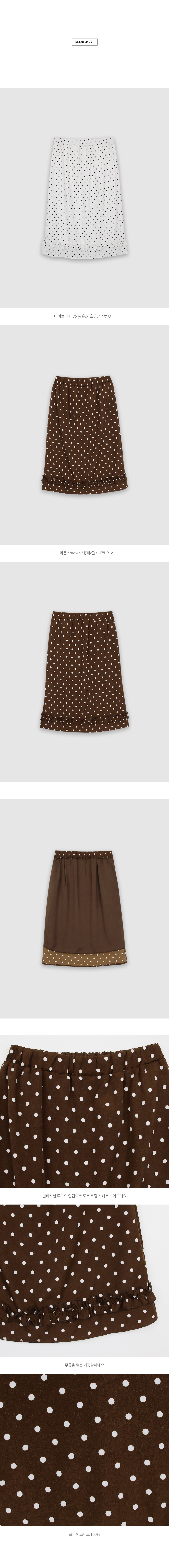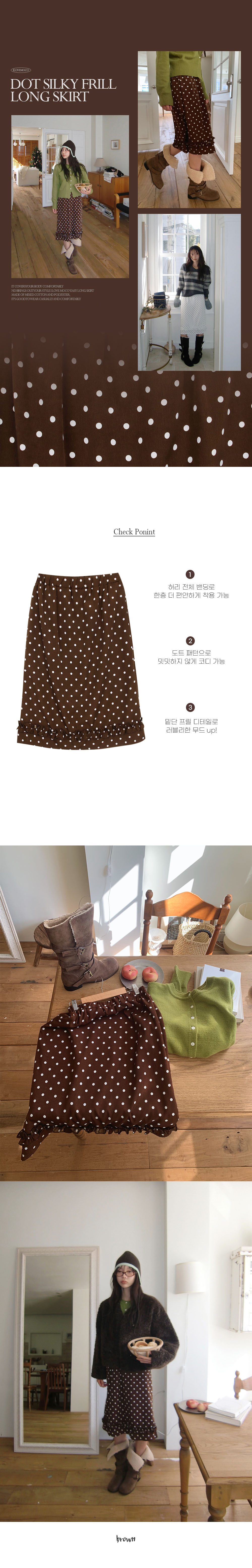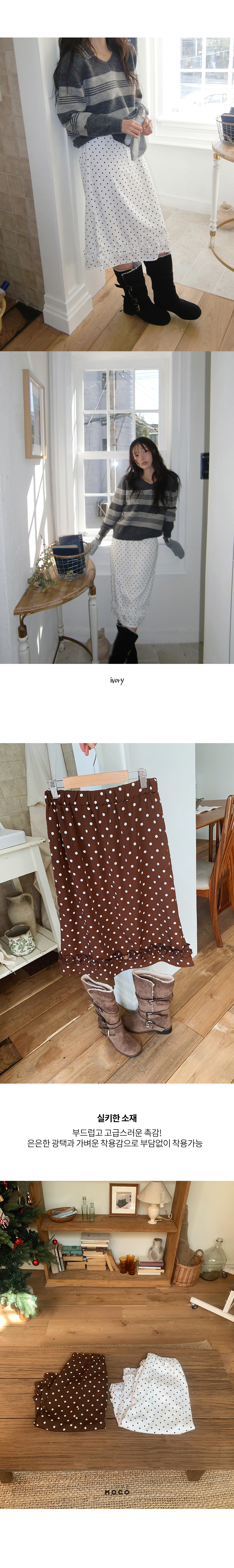 도트 패턴과 밑단 프릴 디테일로 포인트를 준 러블리한 무드의 알럽모코 도트 프릴 롱스커트