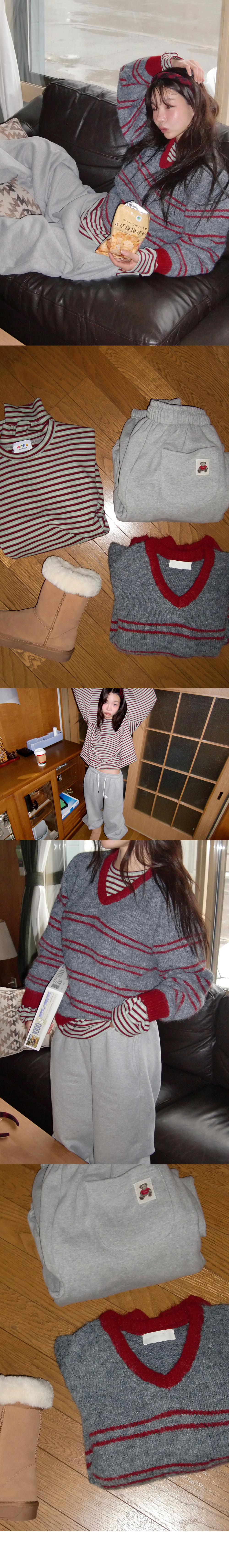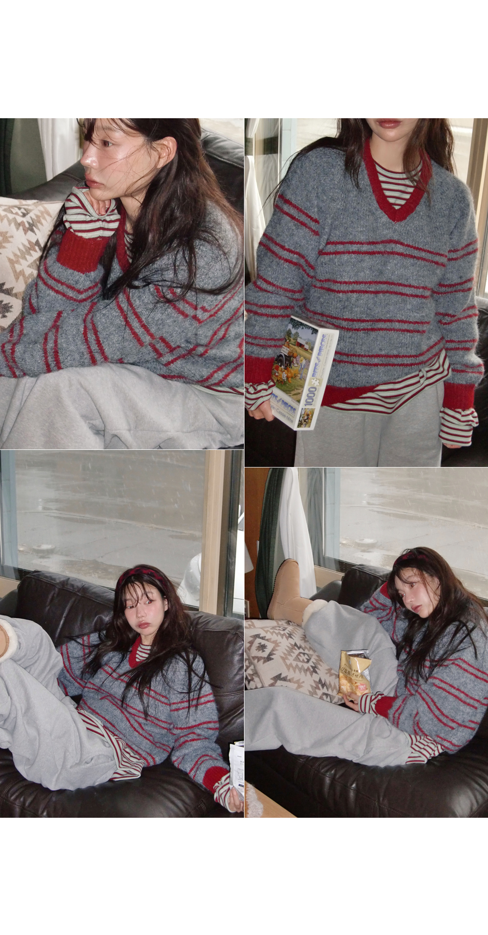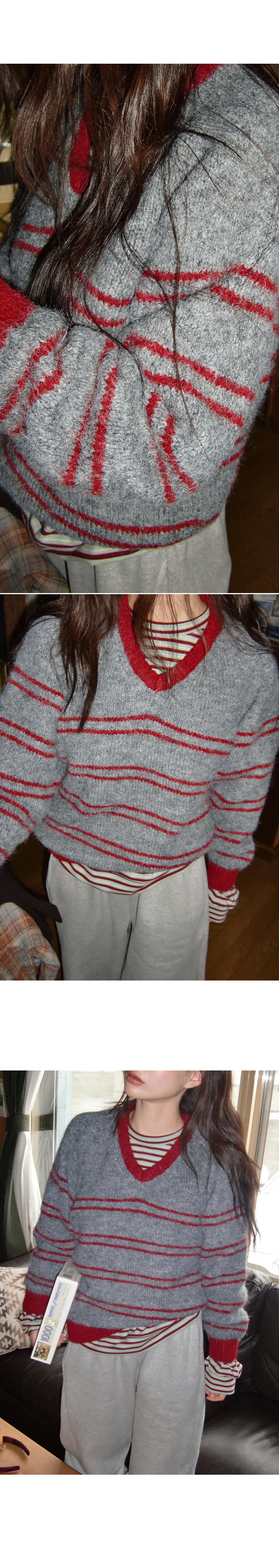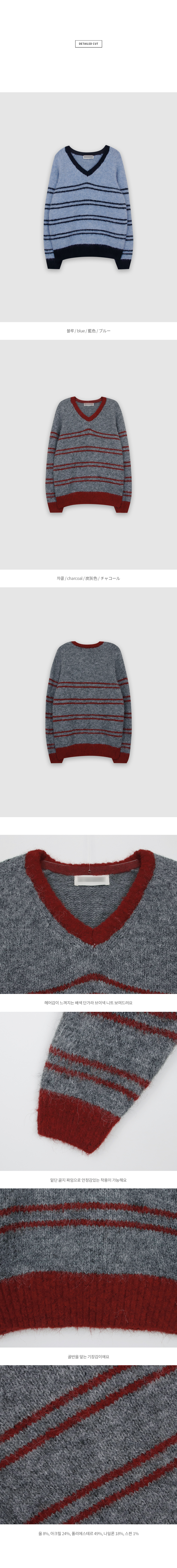 헤어감이 느껴지는 배색 단가라 브이넥 니트