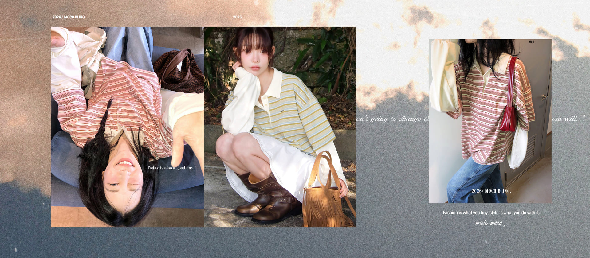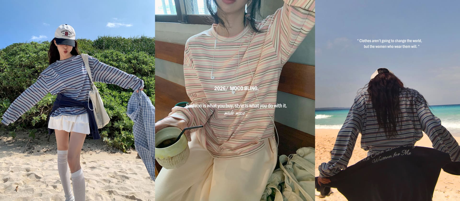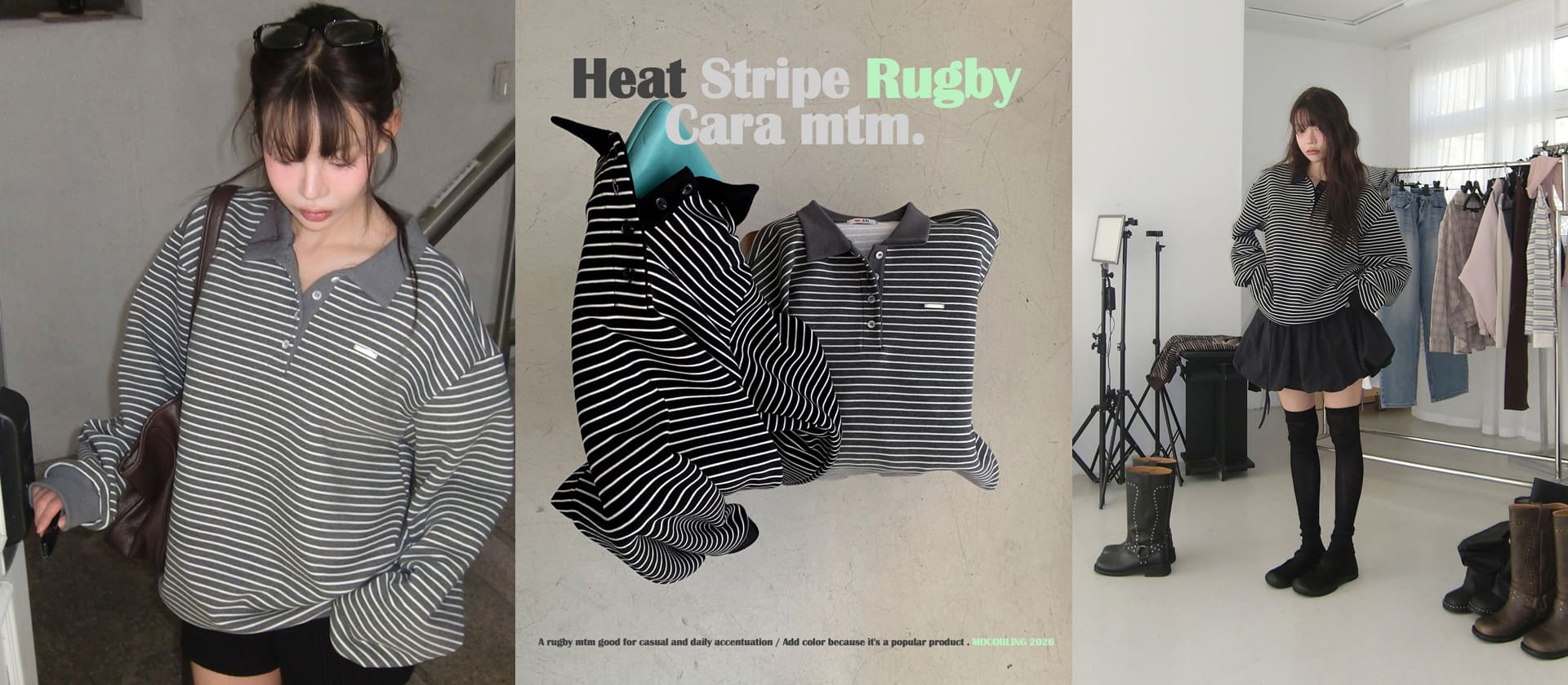 주문폭주! 소라 + 브라운 베스트 컬러 조합으로 소장 가치 up,스타일리시하고 편안하게 즐기는 모코위드 럭비 스트라이프 카라 맨투맨