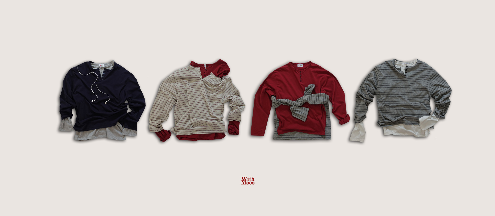 반팔+긴팔 레이어드 디자인의 모코위드 스트라이프 럭비 카라 티셔츠