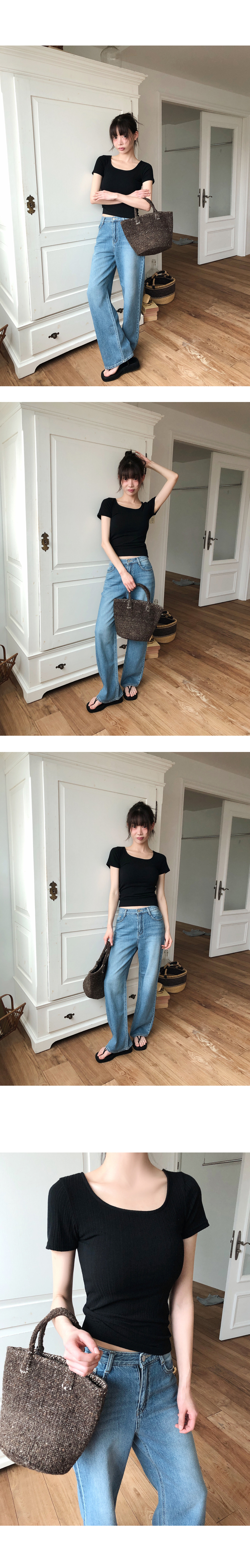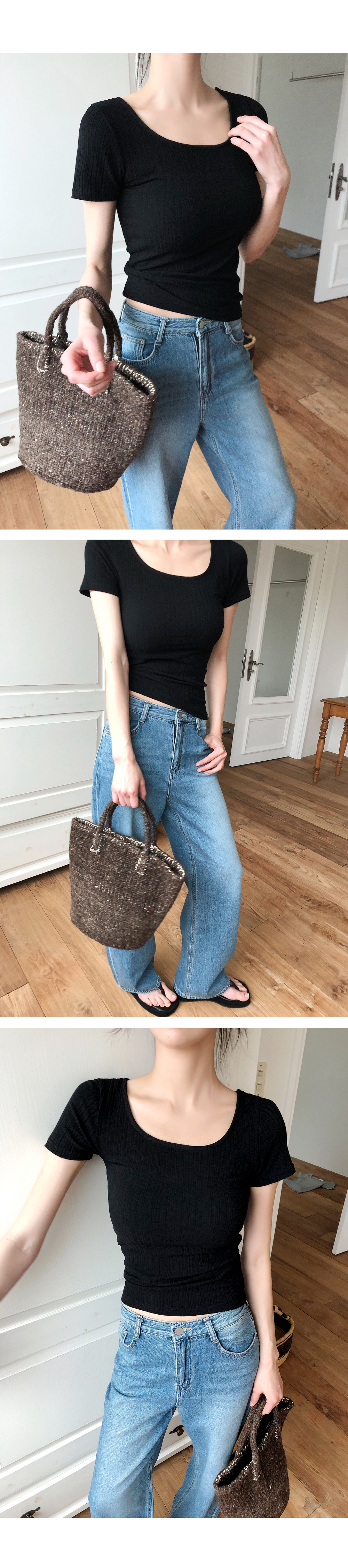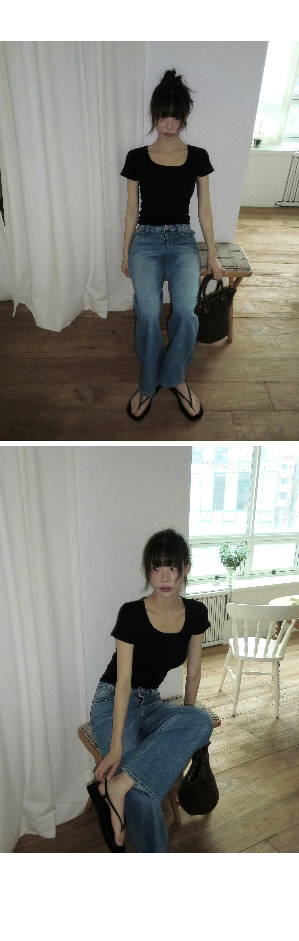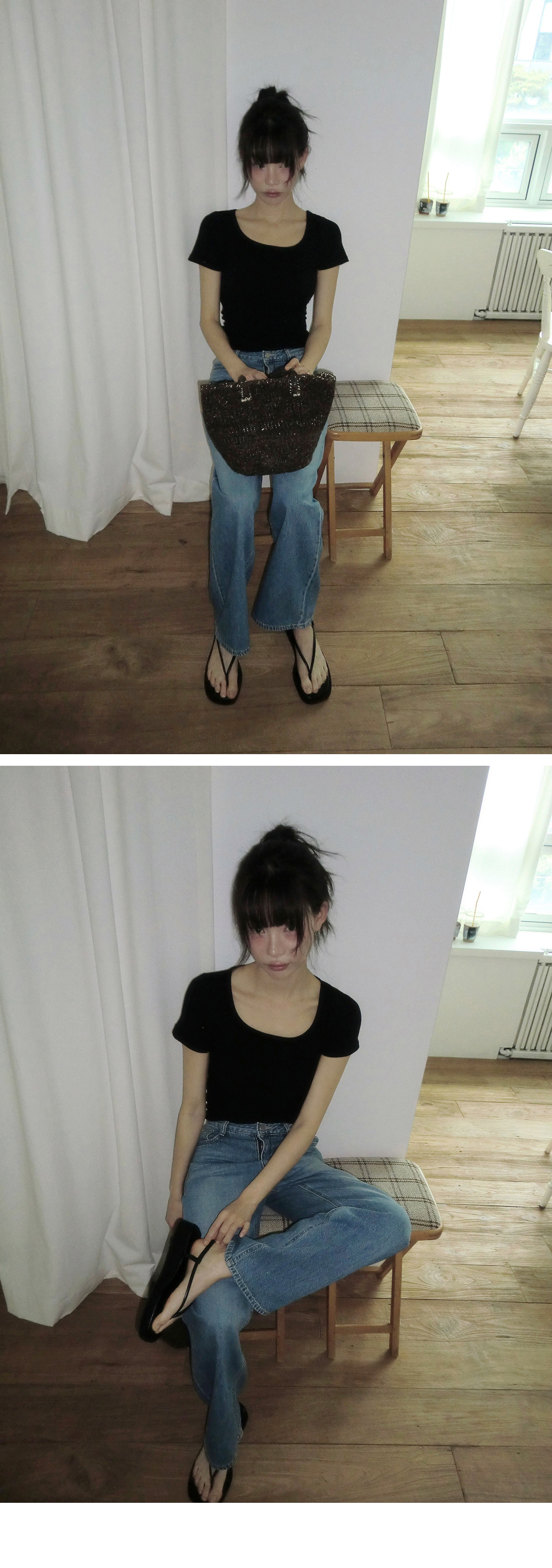 “골반은 평균이며 엉덩이가 작고 하의는 S사이즈를 입어요. 다리가 긴 편이라서 짧 은 기장감의 하의는 M사이즈도 입어요. 상의는 어깨가 있는 편이고 가슴사이즈는75C입니다.”