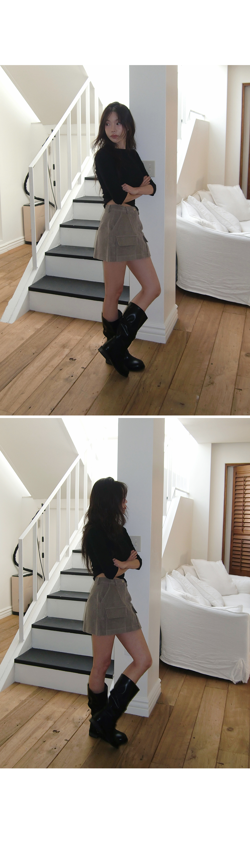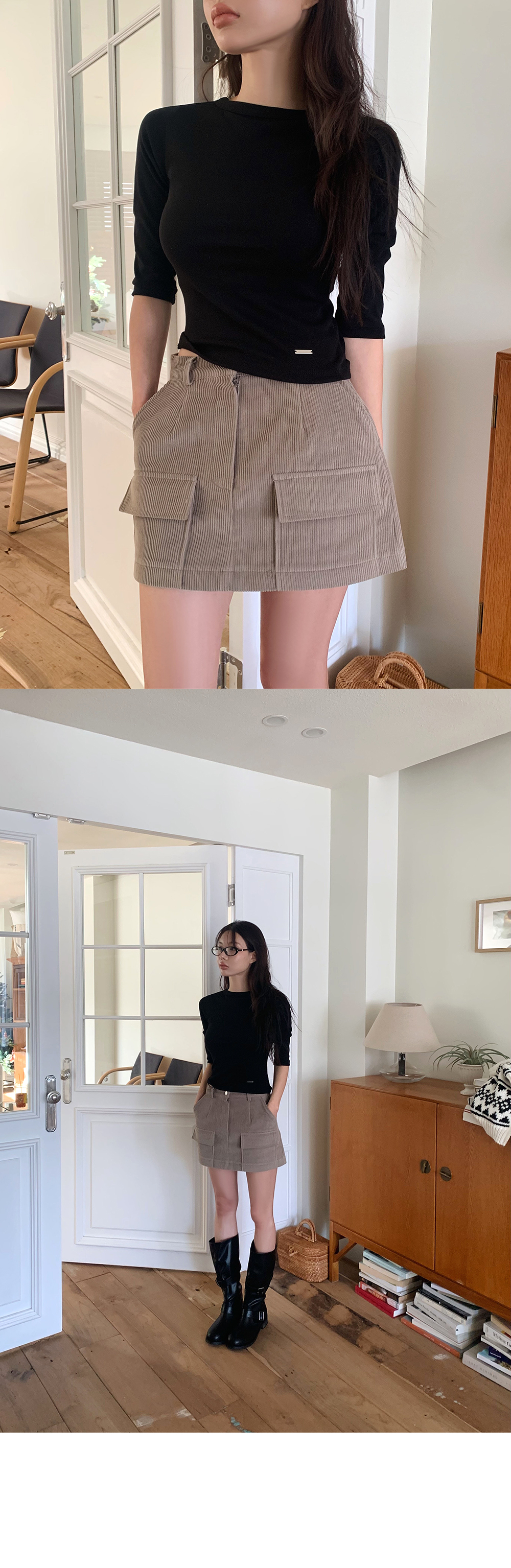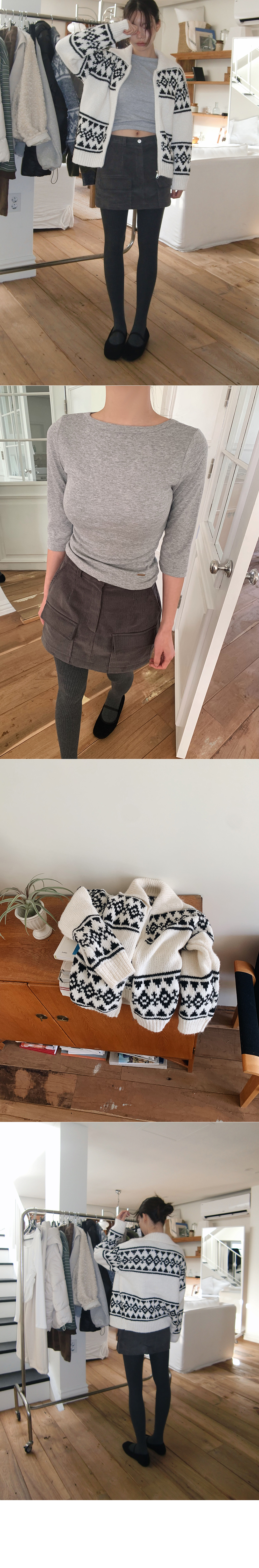“골반은 평균이며 엉덩이가 작고 하의는 S사이즈를 입어요. 다리가 긴 편이라서 짧 은 기장감의 하의는 M사이즈도 입어요. 상의는 어깨가 있는 편이고 가슴사이즈는75C입니다.”