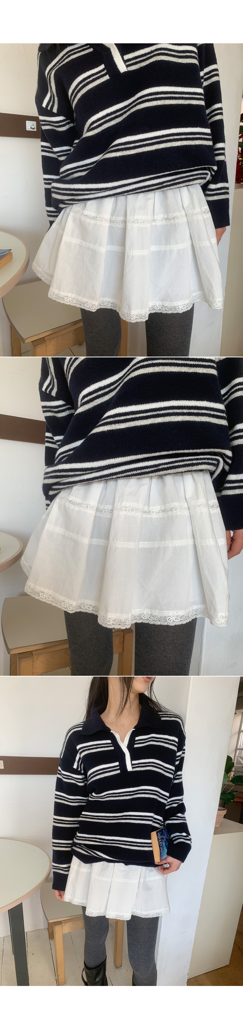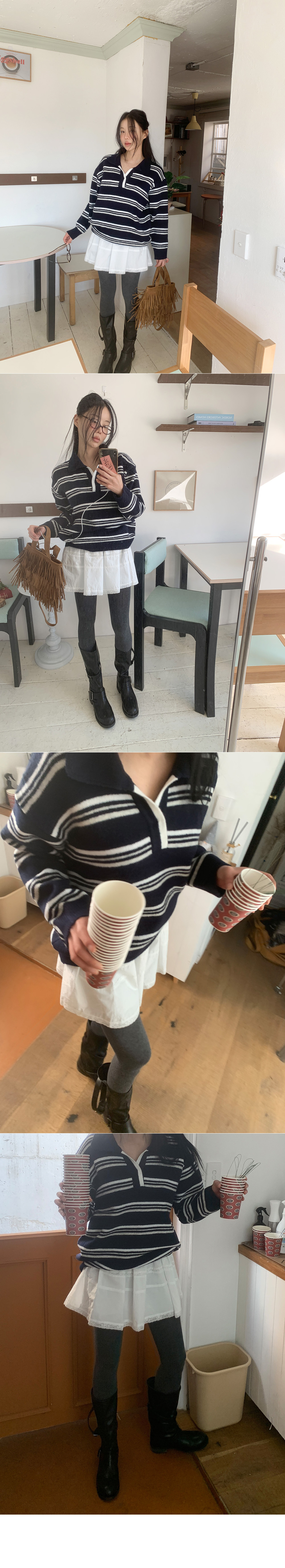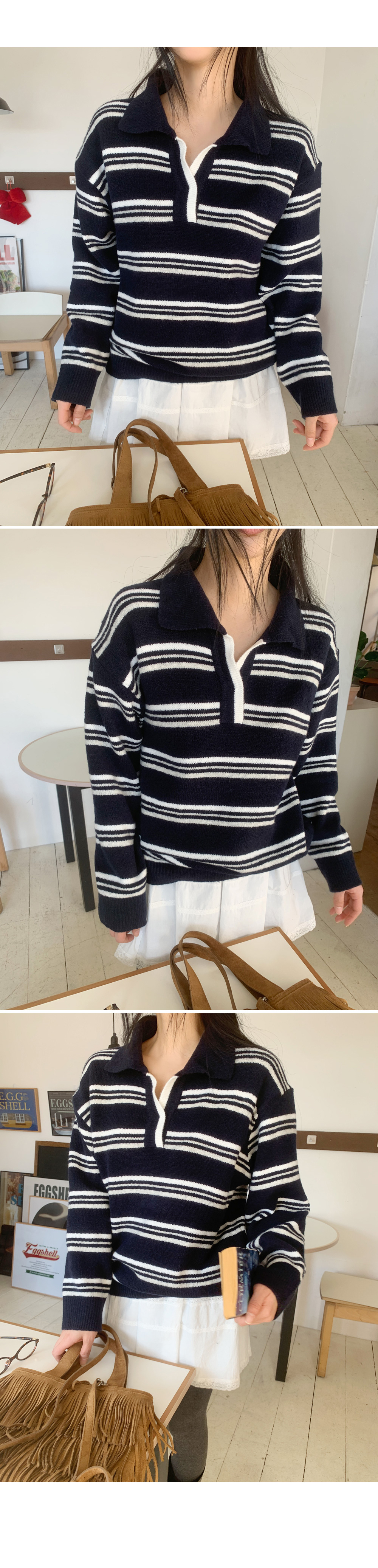 트리플 스트라이프 패턴의 루즈&박시한 핏감! 스트라이프 럭비 카라 니트