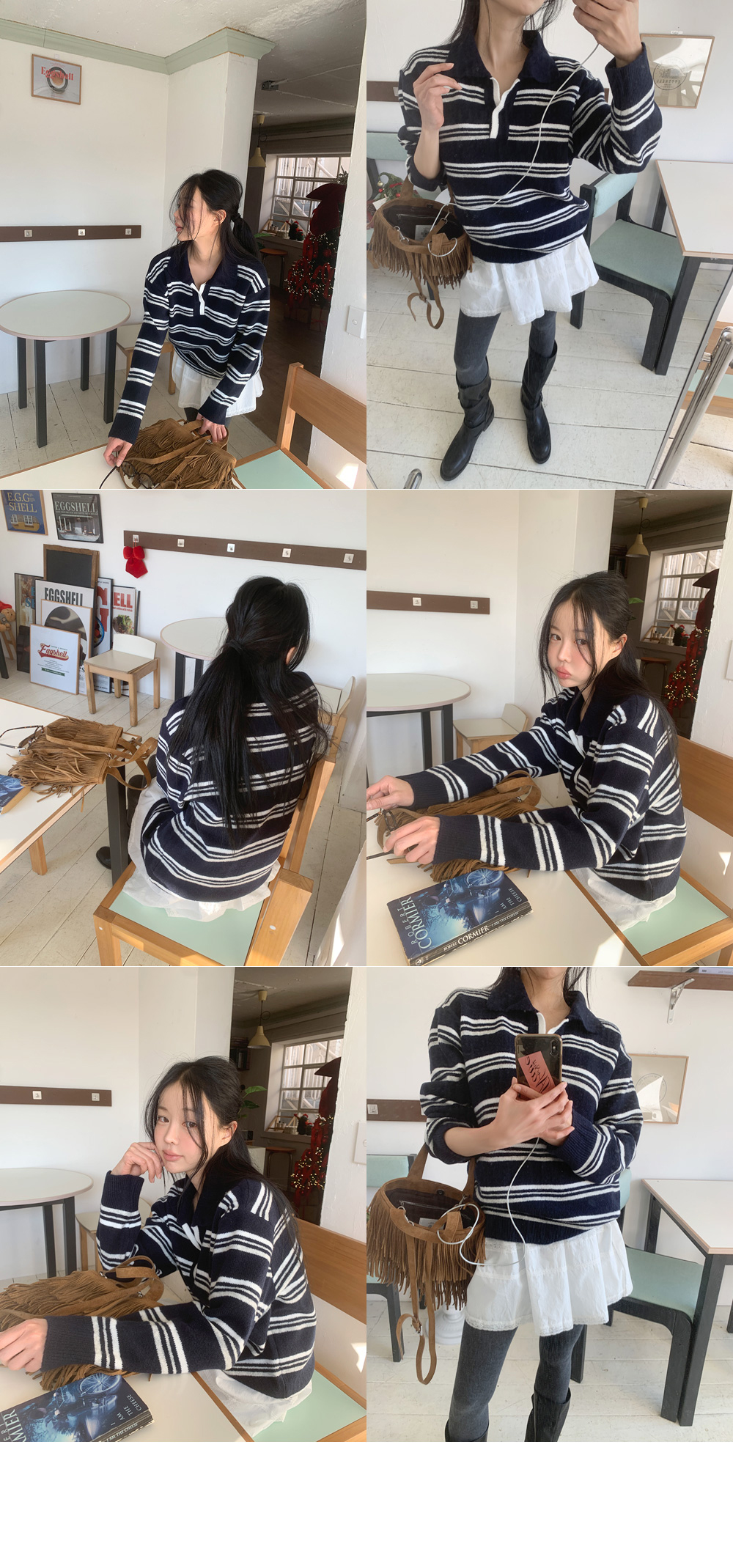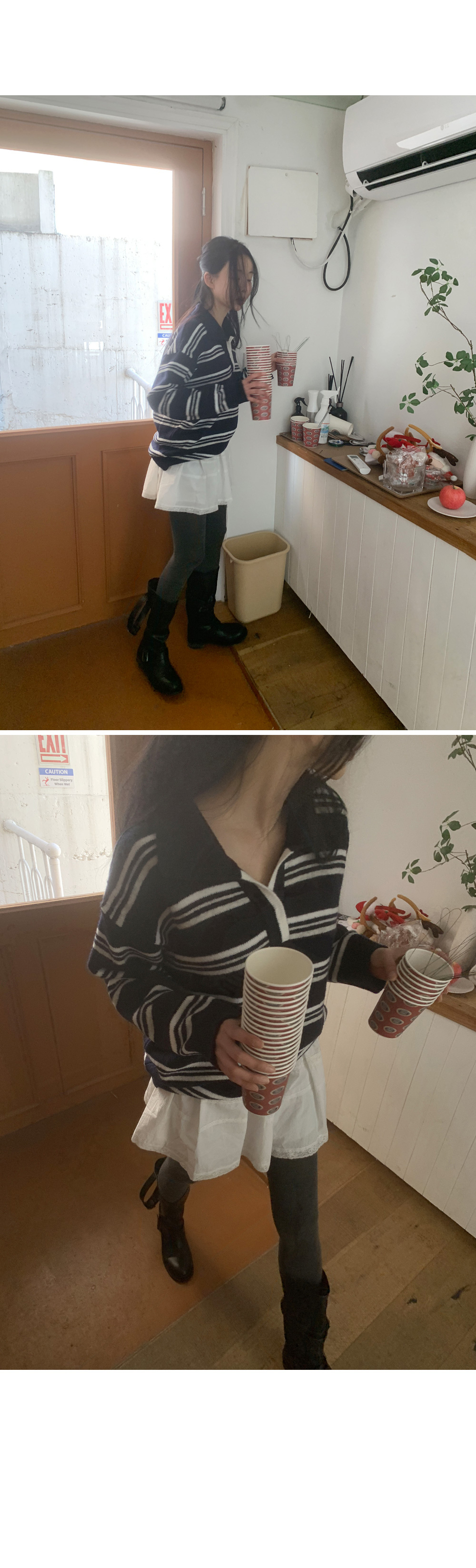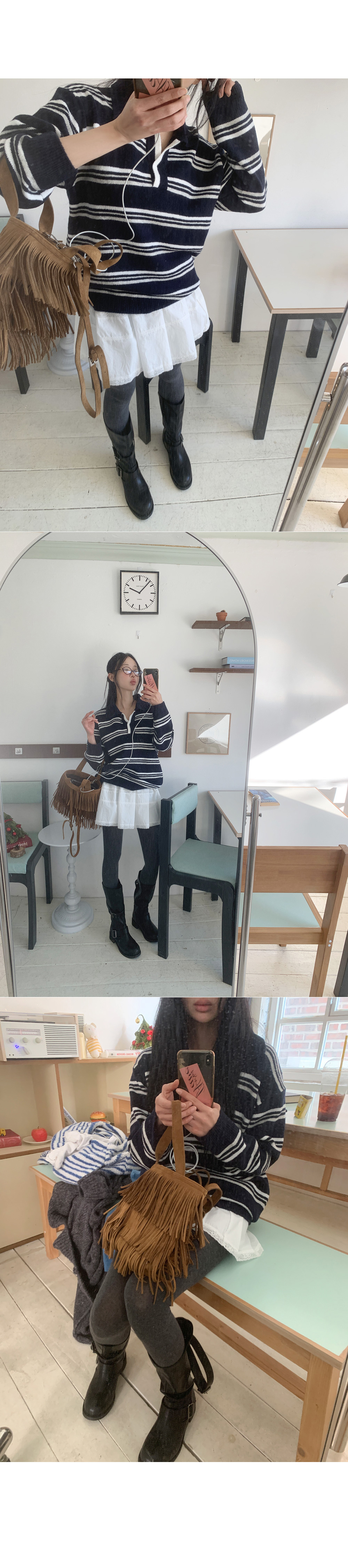 트리플 스트라이프 패턴의 루즈&박시한 핏감! 스트라이프 럭비 카라 니트