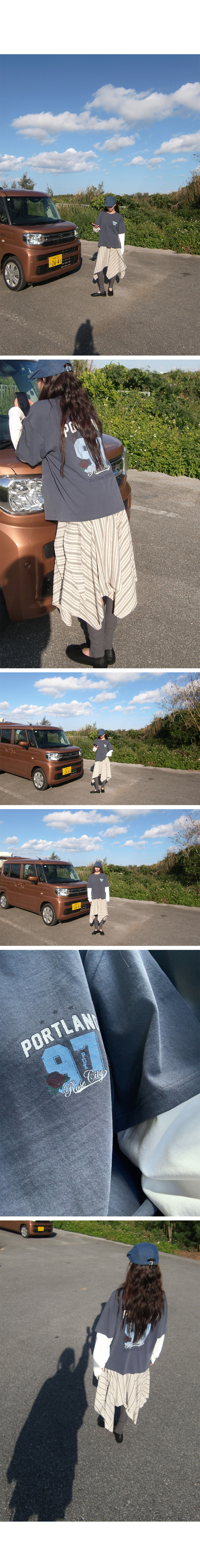 사이드 스트랩 포인트의 스트라이프 미디스커트