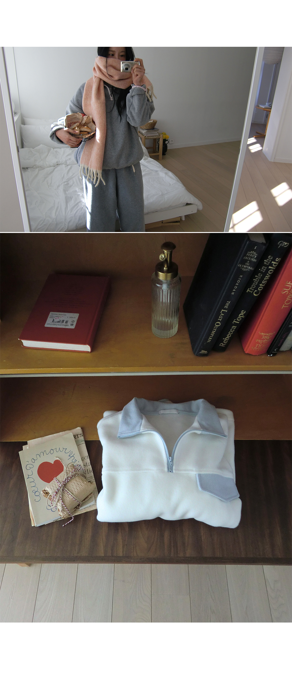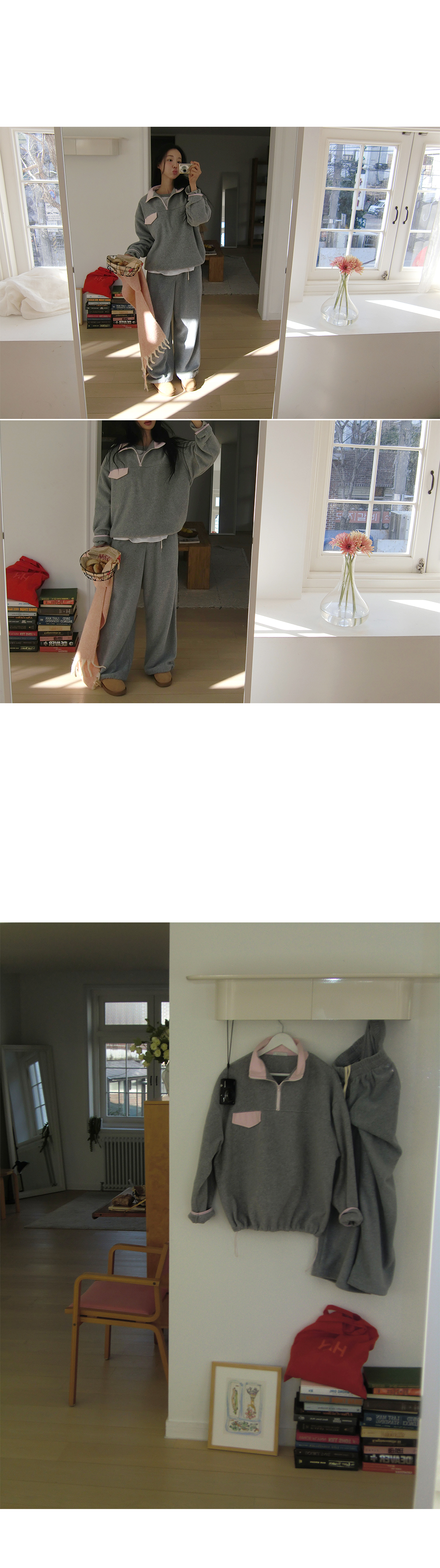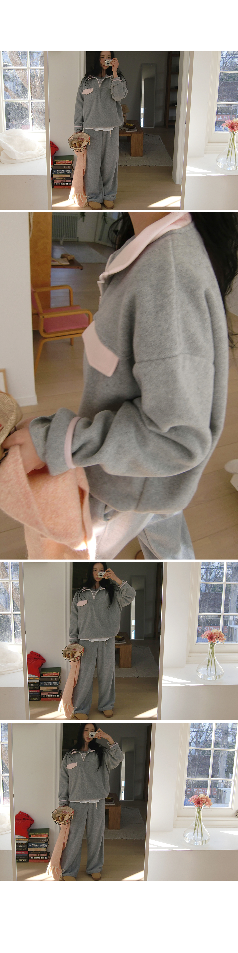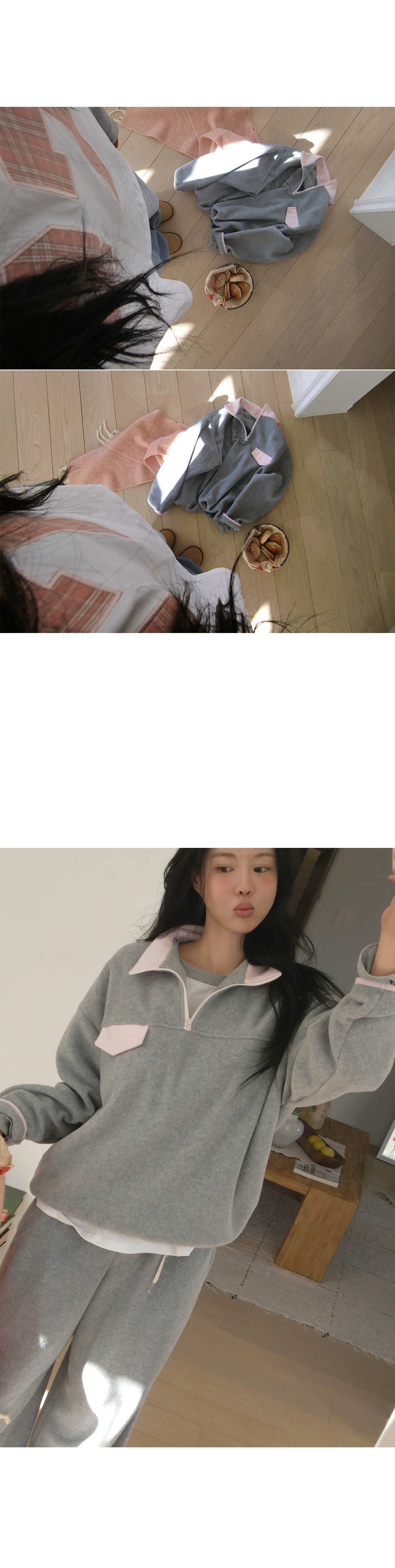 “골반은 평균이며 엉덩이가 작고 하의는 S사이즈를 입어요. 다리가 긴 편이라서 짧 은 기장감의 하의는 M사이즈도 입어요. 상의는 어깨가 있는 편이고 가슴사이즈는75C입니다.”