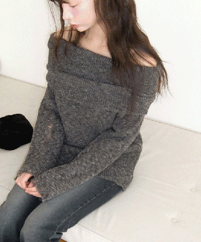 데미지 디테일로 포인트를 준 폴드 오프숄더 니트