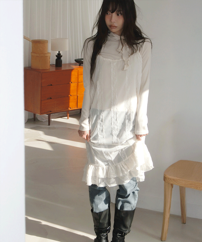 롱한 기장감의 슬리브리스 원피스, 퓨어한 느낌의 레이스 패턴과 밑단 프릴이 매력! 4계절 내내 레이어드해서 코디하기 좋아요