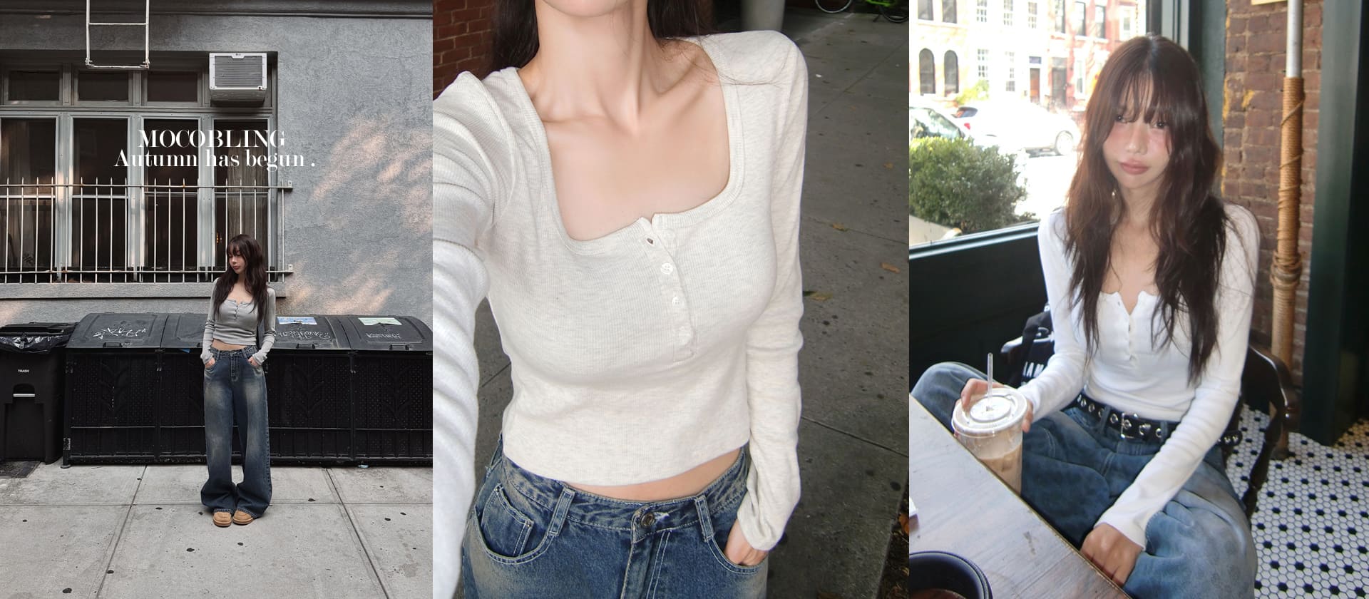[MADE/무배]골지 유넥 단추 티셔츠 #골지티 #단추티 #유넥티 #스퀘어넥 #이너티 #긴팔티 #버튼티 #가을상의 #가을티셔츠 #티셔츠 #슬림핏 #기본템