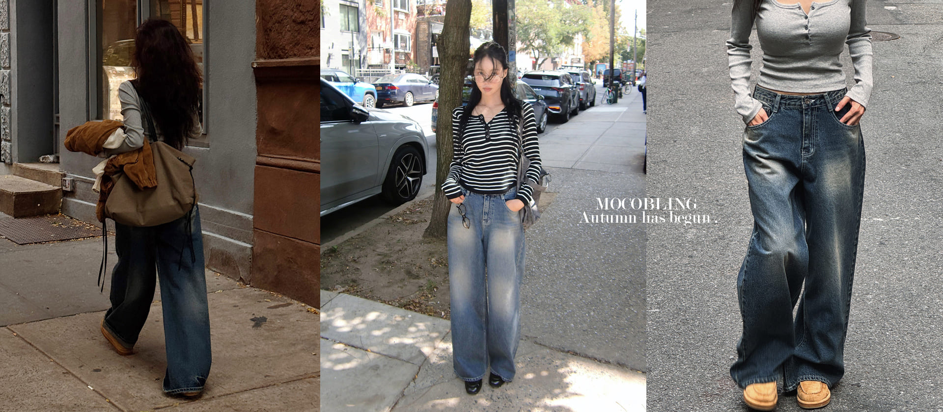 레그 절개 디테일이 멋스럽고, 벌룬&와이드 핏으로 입었을때 힙해보이는 모코데님만의 청바지.