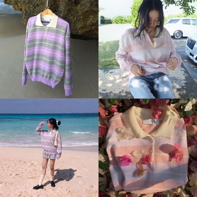 봄에 어울리는 파스텔 컬러감의 알럽모코 럭비 스트라이프 카라 긴팔니트
