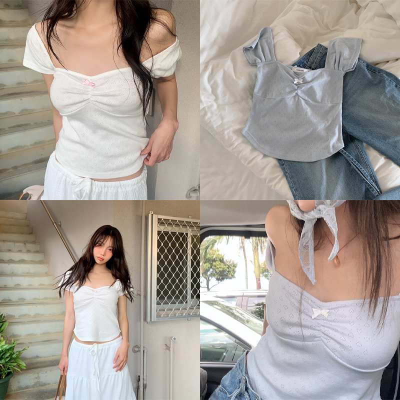 61931 [MADE/오늘출발]리본 하트펀칭 스퀘어티 #셔링티 #리본티 #하트펀칭티 #반팔티 #코튼티 24000