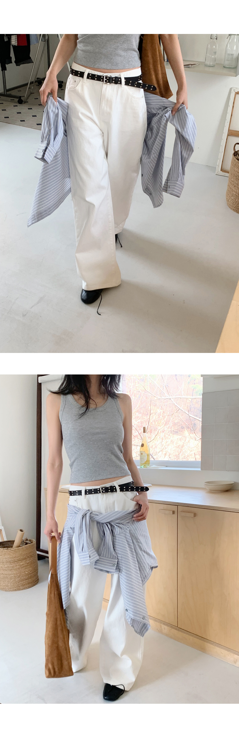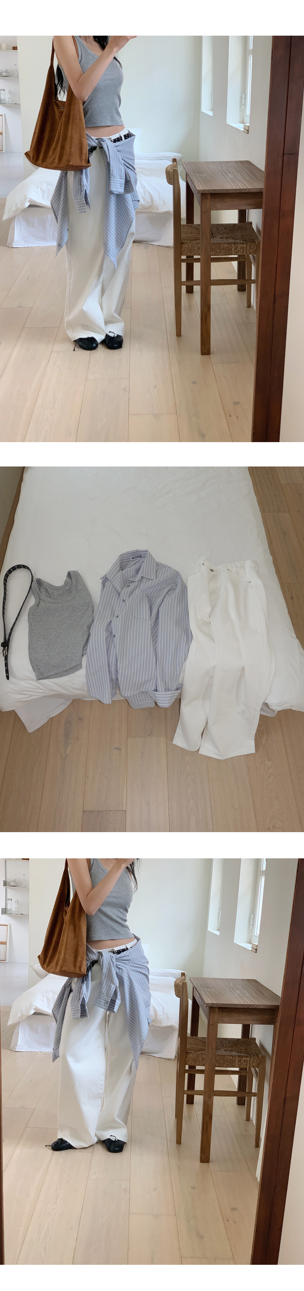 “골반은 평균이며 엉덩이가 작고 하의는 S사이즈를 입어요. 다리가 긴 편이라서 짧 은 기장감의 하의는 M사이즈도 입어요. 상의는 어깨가 있는 편이고 가슴사이즈는75C입니다.”