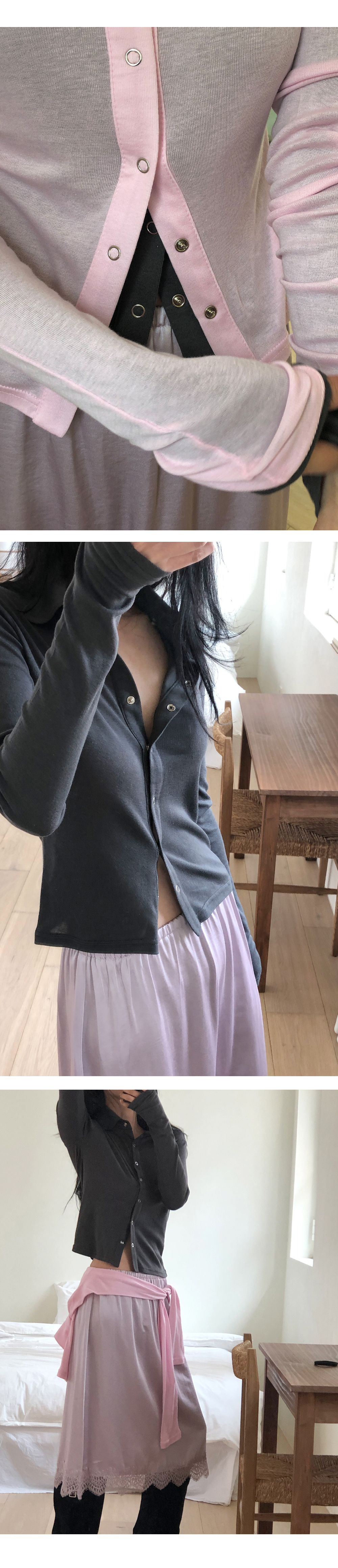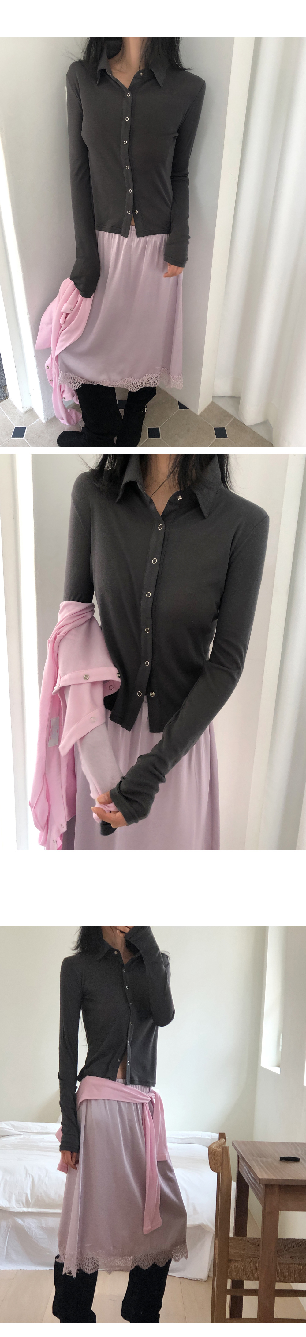 “골반은 평균이며 엉덩이가 작고 하의는 S사이즈를 입어요. 다리가 긴 편이라서 짧 은 기장감의 하의는 M사이즈도 입어요. 상의는 어깨가 있는 편이고 가슴사이즈는75C입니다.”