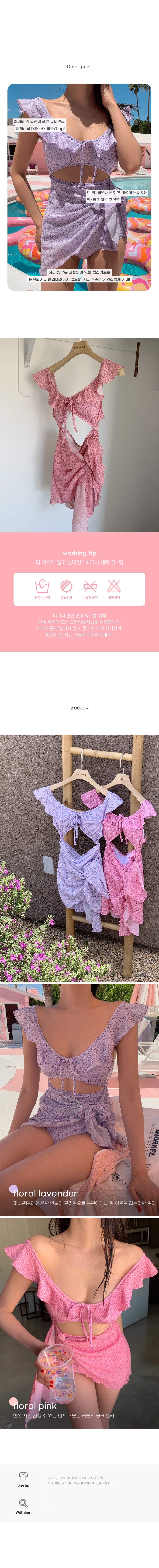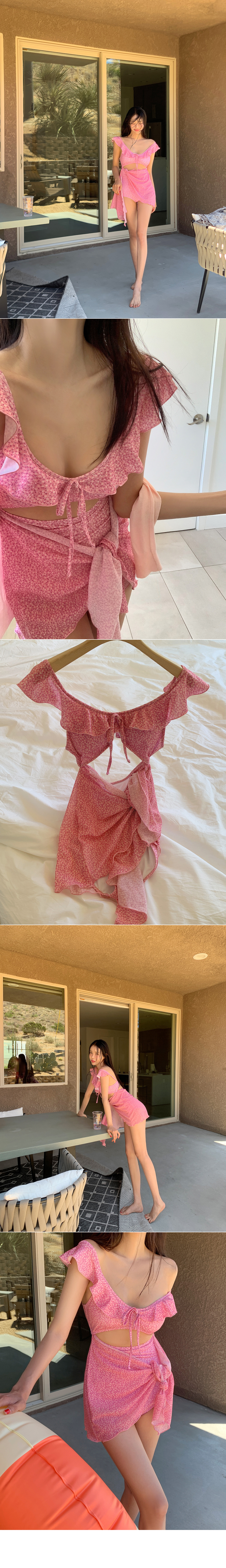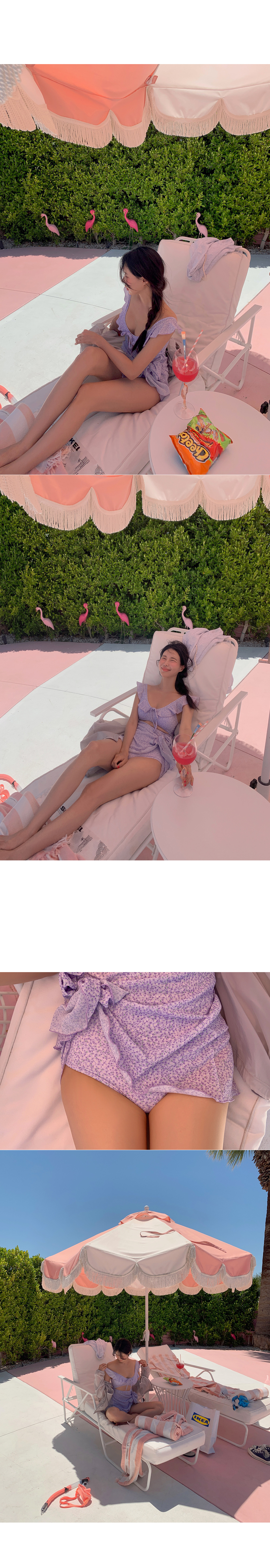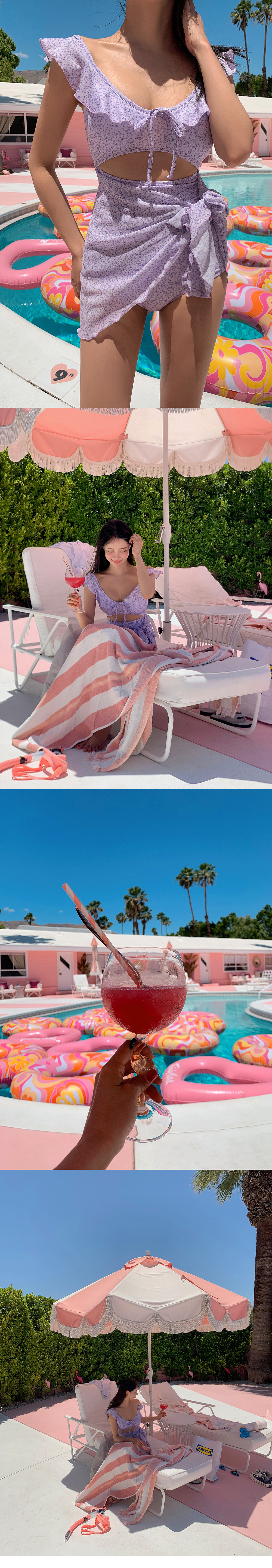 랩스커트로 부담 없이 입어지는 모코아일랜드 러블리 모노키니♡ 어깨와 넥 라인 프릴 디테일로 사랑스러움까지 돋보여요:)