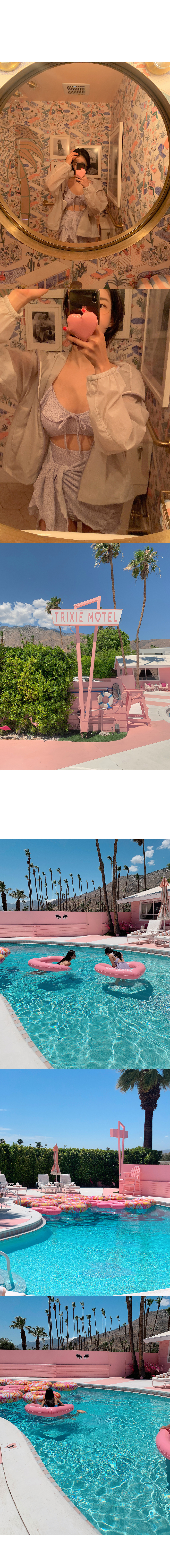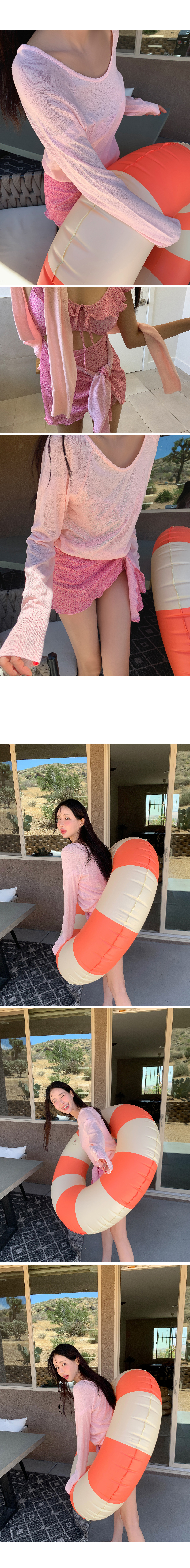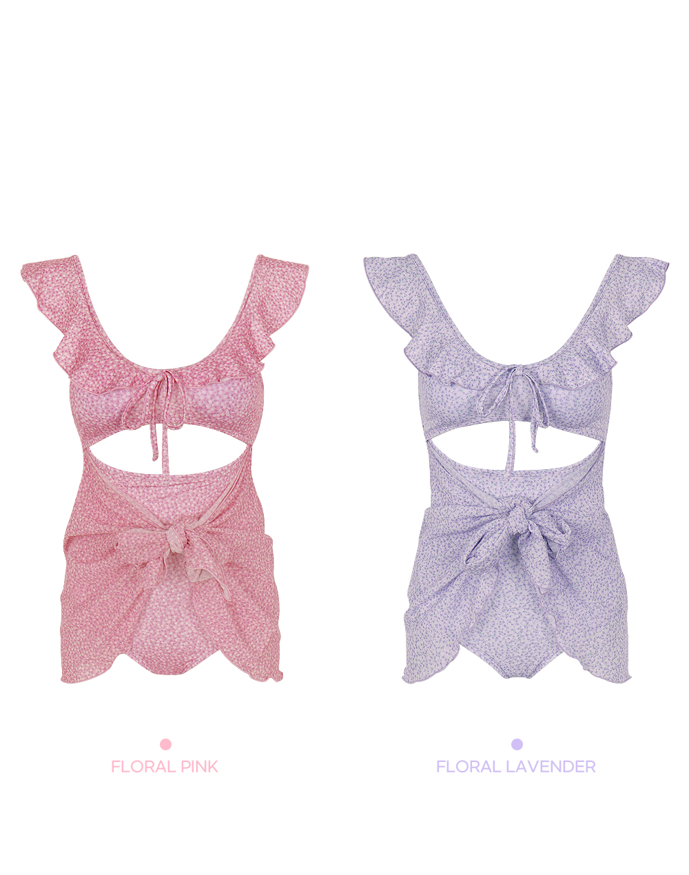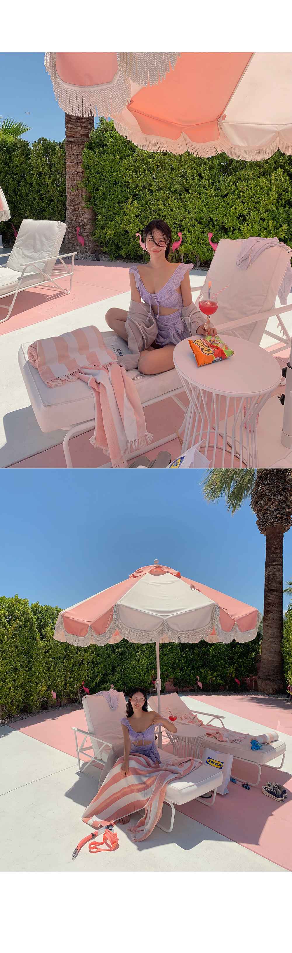 랩스커트로 부담 없이 입어지는 모코아일랜드 러블리 모노키니♡ 어깨와 넥 라인 프릴 디테일로 사랑스러움까지 돋보여요:)