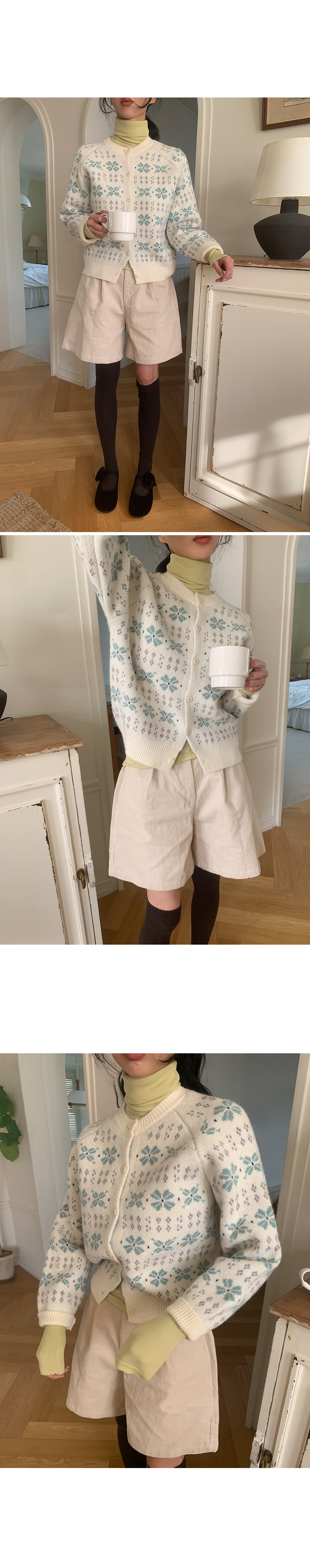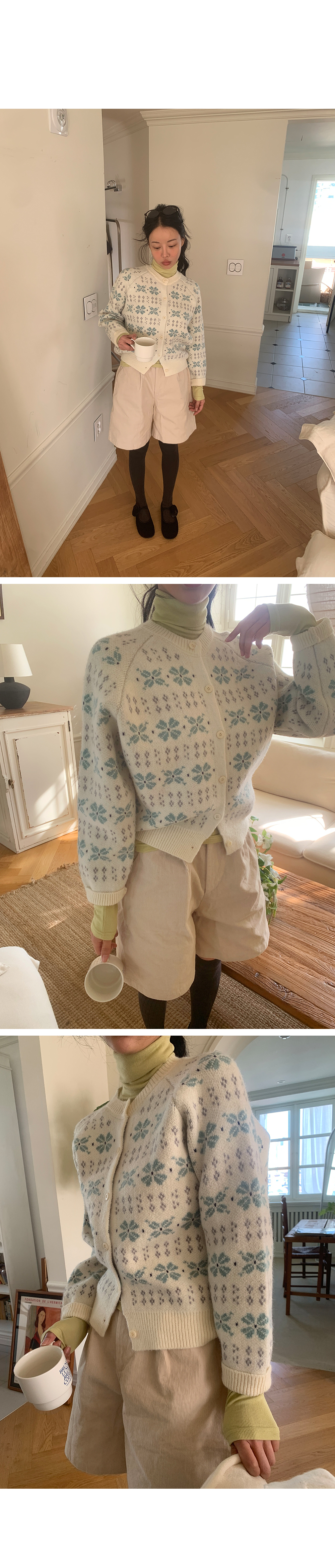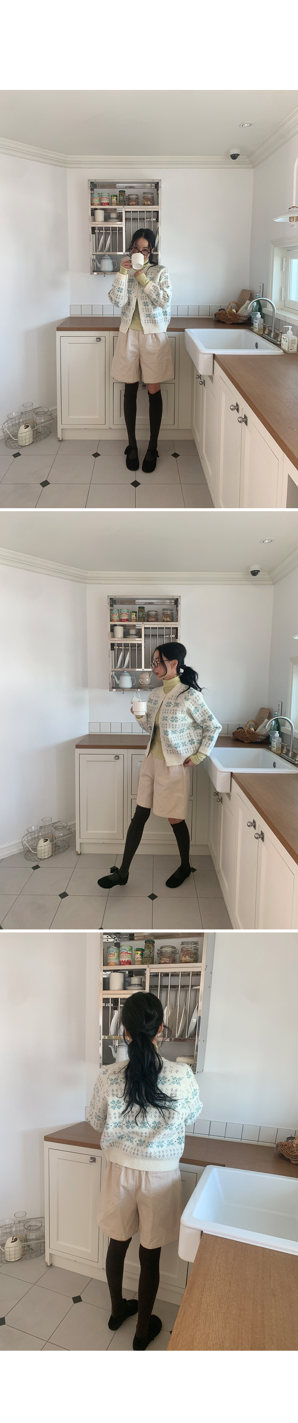 “골반은 평균이며 엉덩이가 작고 하의는 S사이즈를 입어요. 다리가 긴 편이라서 짧 은 기장감의 하의는 M사이즈도 입어요. 상의는 어깨가 있는 편이고 가슴사이즈는75C입니다.”
