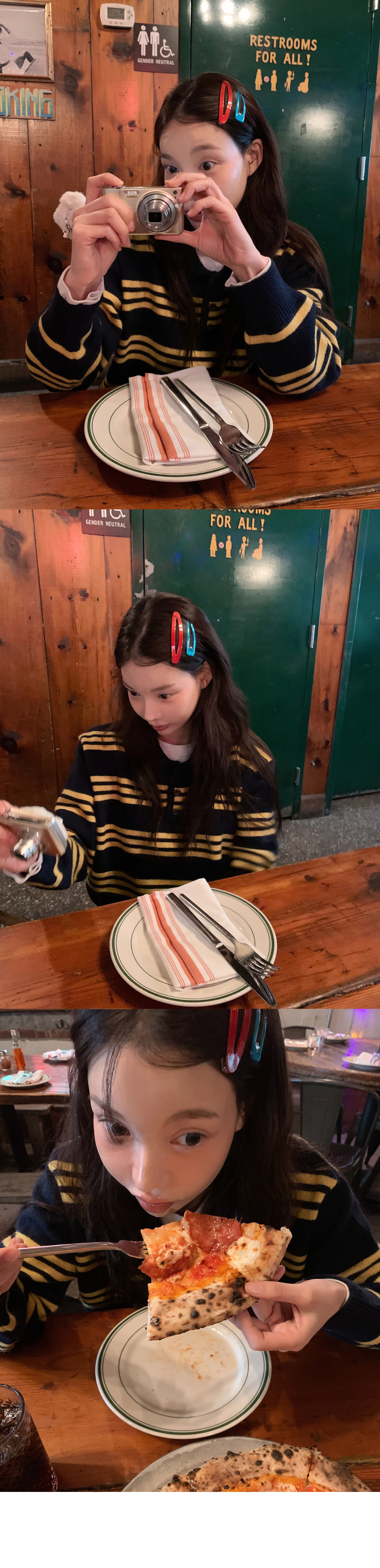 컬러플한 스트라이프 패턴의 귀여운 단추 카라 니트